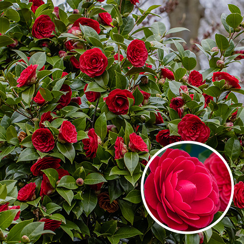 Het bijzondere aan de Camelia (Camellia) is dat deze heester al bloeit, wanneer andere planten nog bladeren moeten krijgen. De vroege bloeier Camellia japonica 'Black Lace' (Camelia japonica 'Black Lace') bloeit van februari tot april met schitterende grote, gevulde, roosachtige bloemen. De rode bloemen ruiken heerlijk en betoveren je tuin in de late winter / het vroege voorjaar. Toch zorgen de roosachtige bloemen niet alleen voor veel sierwaarde; ook lichtglanzende, donkergroene bladeren dragen hun steentje hieraan bij. Het hele jaar door blijft het glanzende blad aan de groenblijvende struik hangen. De Camelia 'Black Lace' houdt niet van droogte, is redelijk winterhard en geeft daarom de voorkeur aan een beschutte plek in de halfschaduw. Deze Camelia snoeien is niet nodig, al is het wel mogelijk. Je kunt de veelzijdige en kleurrijke plant als solitair heester planten, maar ook in een border toepassen of als plant in pot op een terras of balkon plaatsen. Met een totale hoogte van zo’n 2 meter is de rode Camellia 'Black Lace' een prachtige aanwinst voor zowel grote tuinen als kleine tuinen.