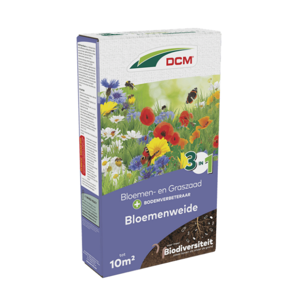 DCM Bloemenweide is gemengd met een organische bodemverbeteraar. Dit mengsel is gevuld met meer dan 50 verschillende soorten weidebloemen, zowel eenjarige als meerjarige.
