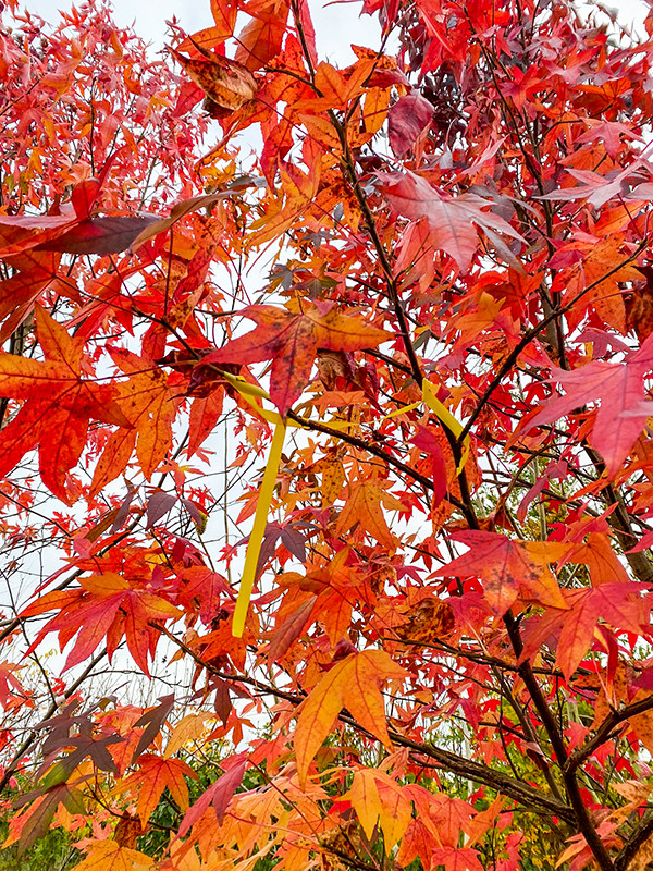 Met een Liquidambar styraciflua of Amberboom is je tuin nooit saai. De grootste troef van deze eyecatcher is het blad: van alle bomen heeft de Amerikaanse Amberboom misschien wel de mooiste herfstkleuren. In de herfst staat de Liquidambar styraciflua in de schijnwerpers door de enorme kleurendiversiteit. De bladeren, die van vuurrood met oranje tot geel en paars kleuren, zorgen voor een betoverend effect. Het blad is 5lobbig (soms 7lobbig), 8 - 16 cm lang en 10 - 20 cm breed, de bladrand is gezaagd en door de prachtige handvorm is het blad ook voor de bijzondere herfstverkleuring – als het glanzend groen is – al een mooi plaatje. Na de gele, oranje, rode en paarse verkleuring valt de handvormig gelobde/ diep ingesneden blad van de boom. Dat is het moment dat je de decoratieve takken en stam eens beter kunt bekijken.