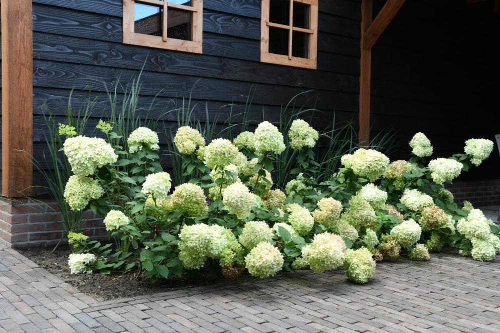 Speciaal voor de kleine tuin zie je hier de Hydrangea paniculata ‘Little Limelight’, een dwergvariant van de ‘Limelight’. Deze compacte Hortensia siert er echter niet minder om! De mooie limegroene bloempluimen op sterke twijgen zijn echte blikvangers en verkleuren in het najaar naar roze. Ze trekken veel vlinders, bijen en andere insecten en zorgen voor een levendige, kleurrijke en sfeervolle border.