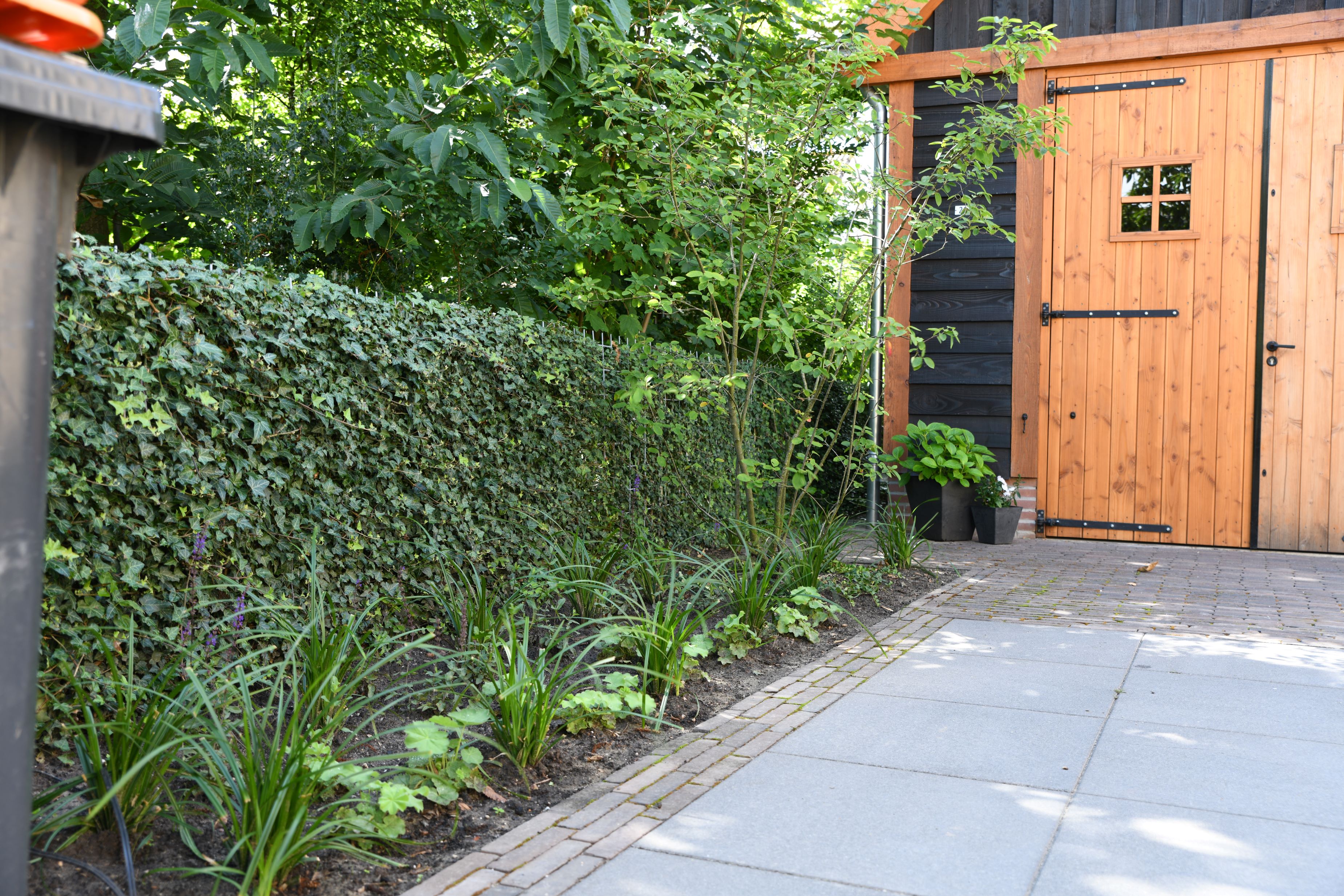 De lage schutting is de groenblijvende Hedera schutting, volledig begroeid met Hedera hibernica (Klimop). Deze sterke klimplant is zeer winterhard én wintergroen, dus ideaal om te gebruiken als altijd-groene erfafscheiding.