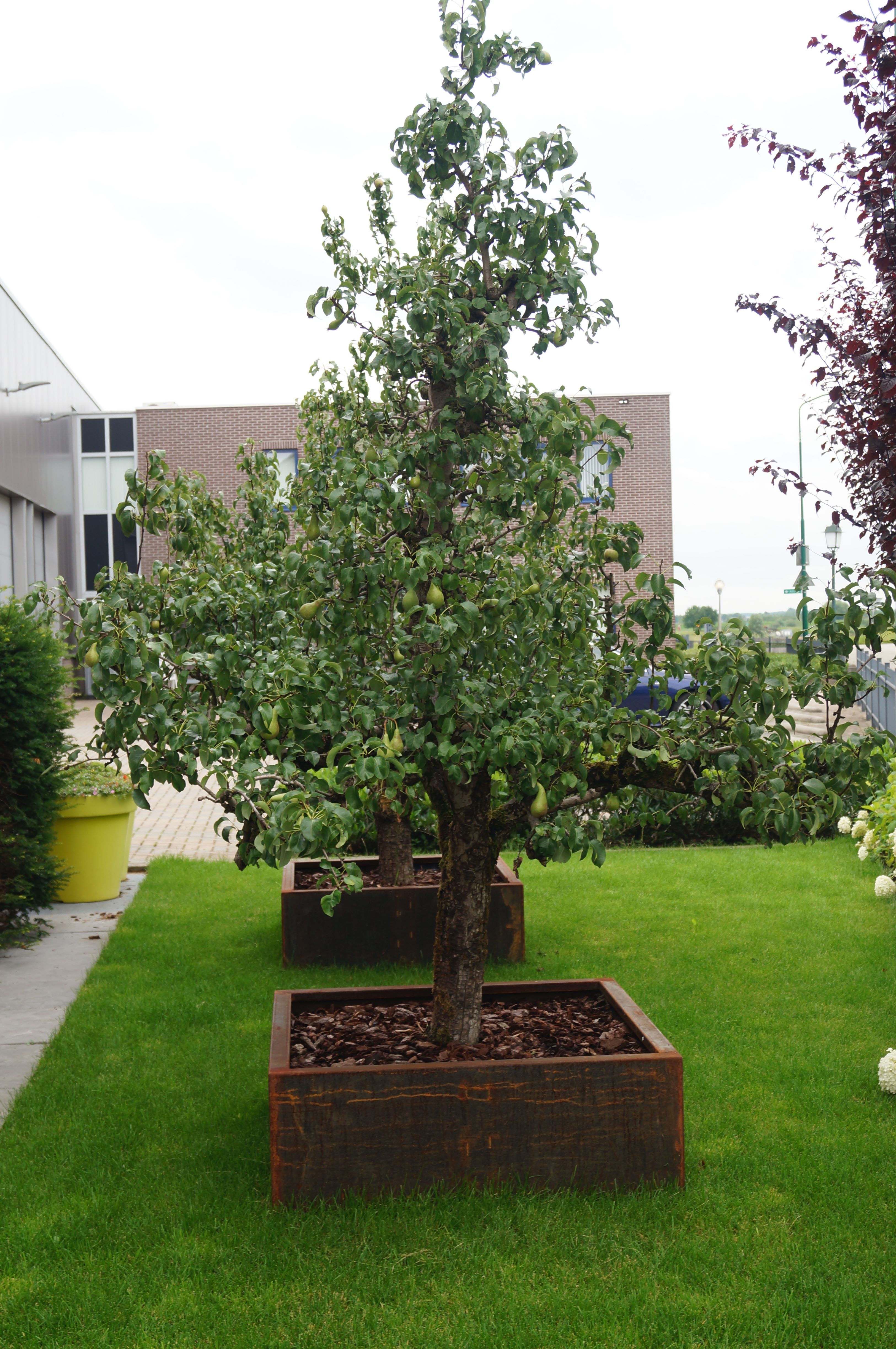 In deze voortuin staan twee van deze karakteristieke perenbomen, allebei in een strakke Cortenstalen plantenbak. Om het plaatje af te maken is de potgrond afgedekt met een laag sierschors. Dit ziet er bijzonder decoratief uit én helpt ook de groei van onkruid te verminderen.