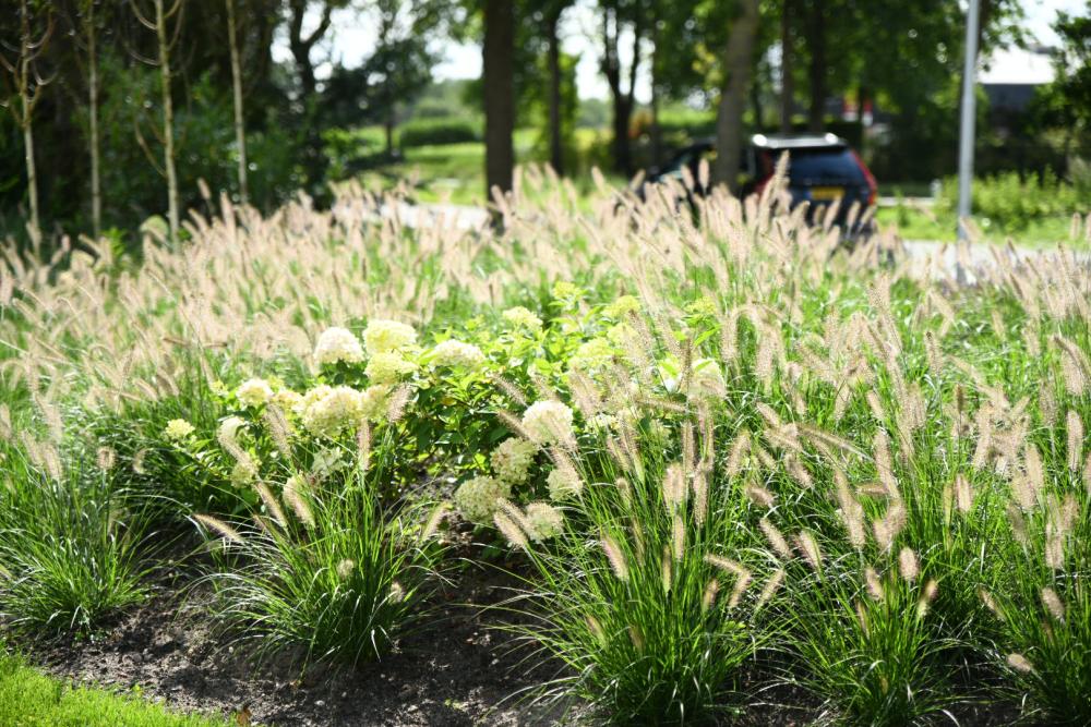 Tussen de Lampenpoetsersgras is de Hortensia Little Lime geplant. De Little Lime is kleiner dan de gewone Hortensia Limelight maar doet zeker niet onder met zijn bloei. Van juli tot oktober kan je genieten van de prachtige groencrème kleurige pluimen die in het najaar oudroze verkleuren.