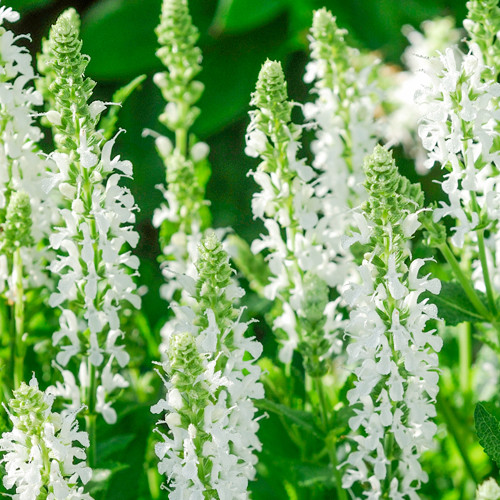 Dit is een witbloeiende Salie met een lange bloeitijd. Het is net als andere Salvia nemorosa soorten een ijzersterke plant, die niet in de border mag ontbreken. De Salvia nemorosa ‘Schneehügel’ bloeit van juni tot en met augustus rijkelijk met schitterende witte bloemaren en wordt dan druk bezocht door vlinders, bijen en hommels. Daarnaast is het een geschikte snijbloem, waardoor je er ook in huis van kunt genieten. Wist je dat je met een Salvia nemorosa twee keer van een spectaculaire bloei kunt genieten? Knip de uitgebloeide bloemen na de bloei direct weg om een nabloei te stimuleren. De witte bloemen van deze Salie plant contrasteren prachtig met de groene, lange, lancetvormige bladeren, waar ze bovenuit steken. Je kunt de ‘Schneehügel’ door de rustige, sierlijke kleur ook mooi combineren met blauwbloemige en roze/paarsbloemige Salies of andere bloeiende vaste planten. Met een totale hoogte van ongeveer 50 cm en luchtige groeiwijze is de zeer decoratieve plant een fantastische aanwinst voor in de border. Behalve het fraaie uiterlijk, is de Salvia nemorosa ‘Schneehügel’ stevig, winterhard en makkelijk te verzorgen. Geef Salie een zonnige standplaats in licht vochtige, maar zeker niet te natte en goed doorlatende, voedzame grond en de charmante bloeier voelt zich snel thuis.