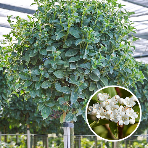 De Viburnum Tinus Eve Price komt van oorsprong uit het Middellandse Zee gebied en is de wintergroene uitvoering van de Viburnum Tinus. De Eve Price wordt ook wel de Sneeuwbal genoemd en is een dicht vertakte struik die zeer compact groeit.
