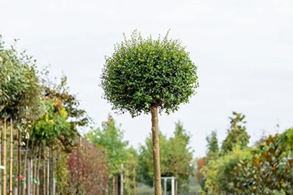 Kleine bol op stam, wintergroen en eenvoudig te onderhouden.